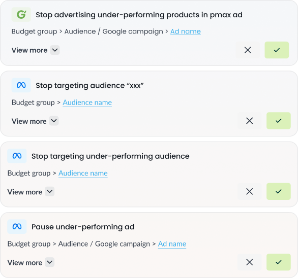 AdScale constantly analyzes live performance data — not just budgets and bids, but who you’re targeting, what you’re promoting, and how you’re saying it. You get clear, actionable recommendations on what to adjust:
